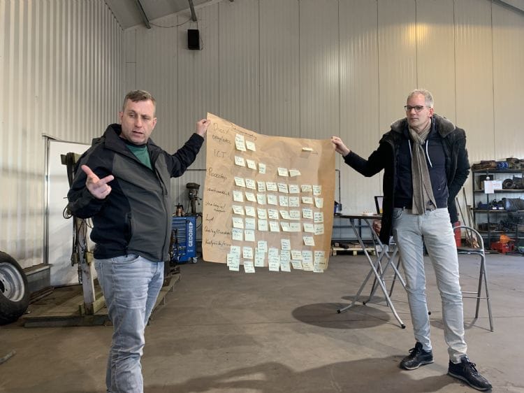 John Lambers en Pieter Peelen met de value stream map van het werkvoorbereidingsproces van Lambers’ hoveniersbedrijf Groenmaat