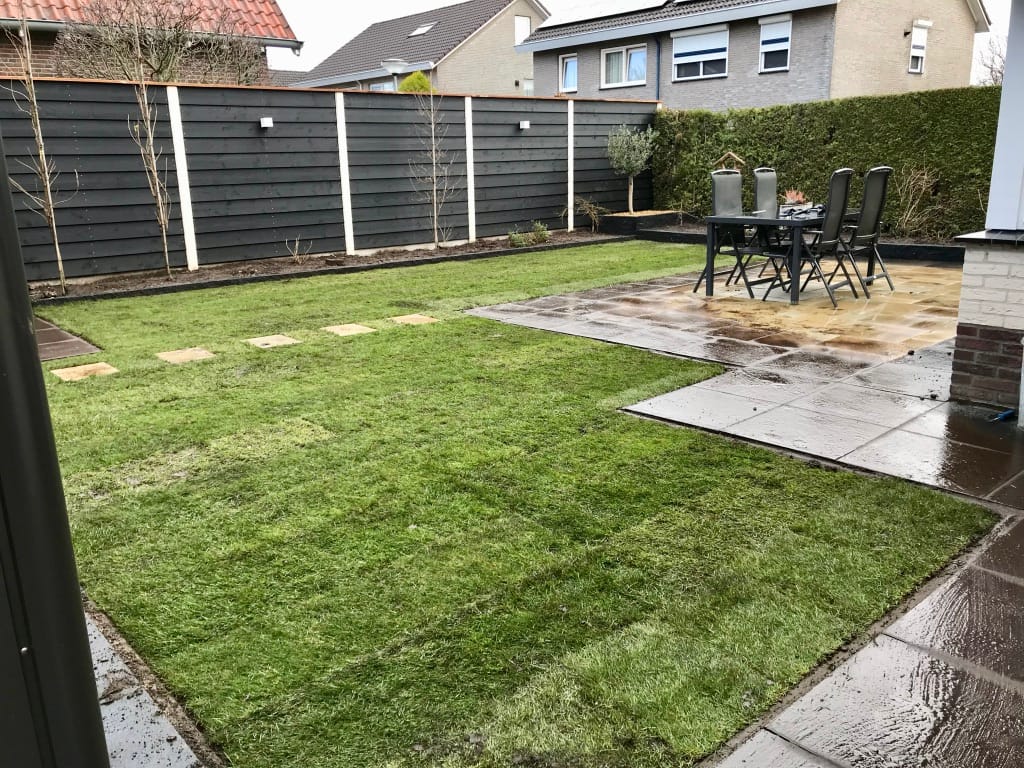 In het vroege voorjaar hebben we in Almelo dit gazon aangelegd. Na wat grond werk en afvoeren van grond hadden we de juiste hoogte te pakken. De step Stones hebben we nadat al het gras is gelegd op de gelegde zoden gelegd. Je kan dan makkelijk schuiven totdat je tevreden bent hoe het ligt. De stenen waren ongeveer 2 cm dik en konden we mooi verdiepen door het gras er onder weg te snijden.