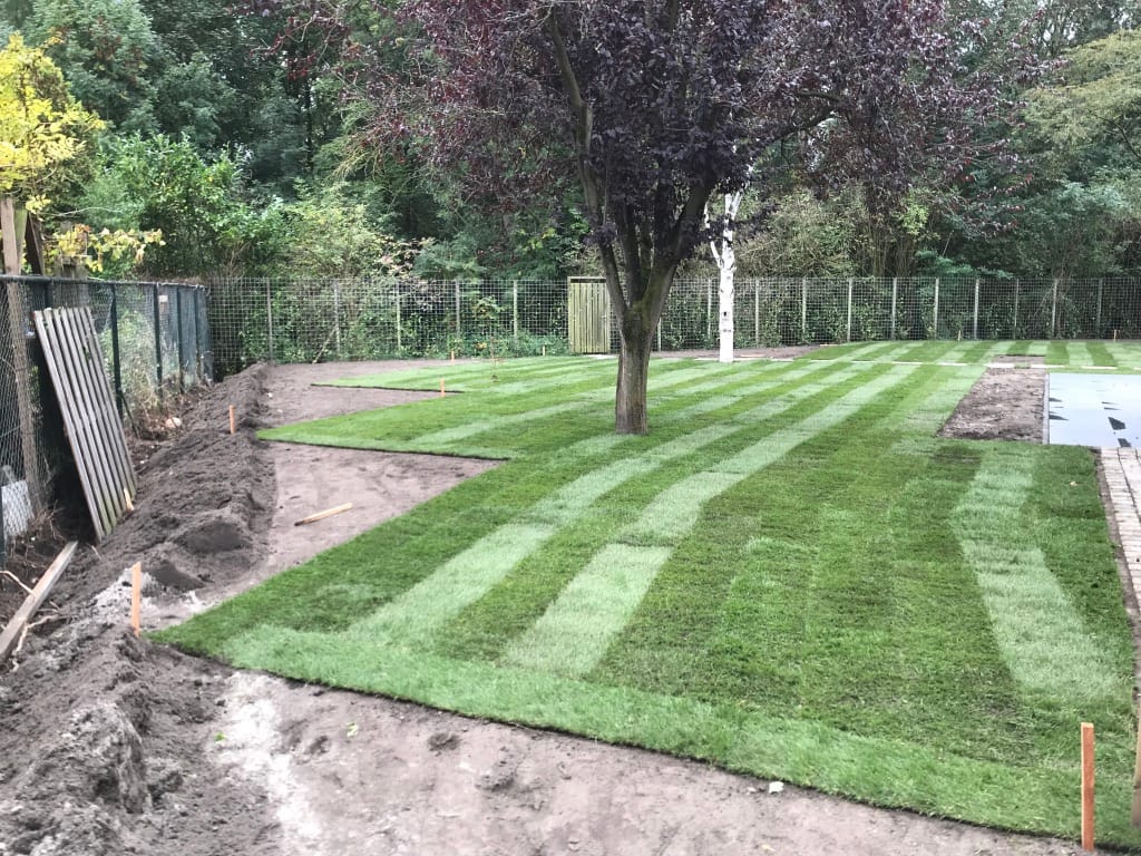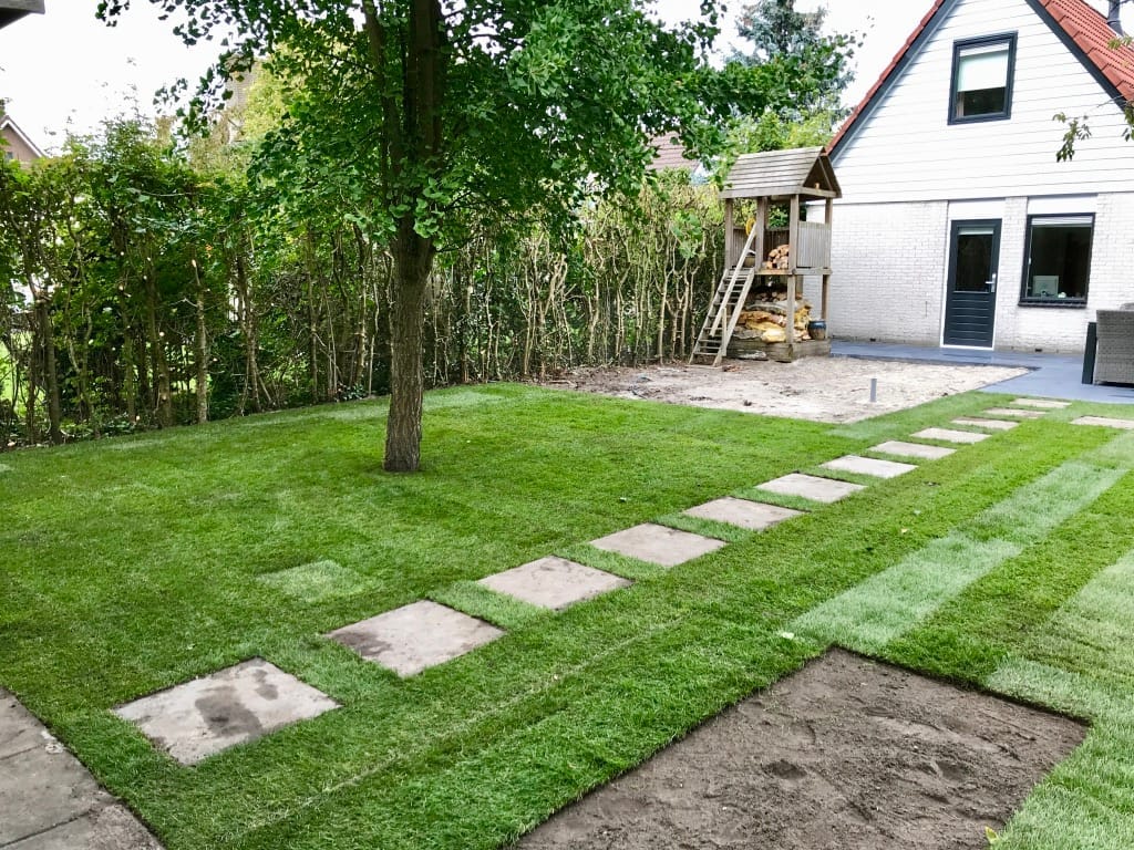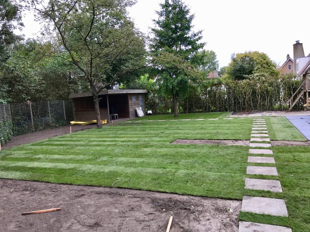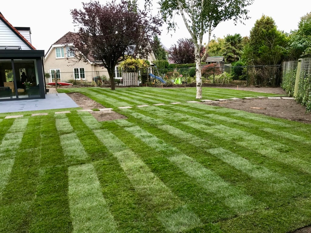 Voor een hoveniersbedrijf hebben we in Almere een groot gazon aangelegd volgens de tekening van een architect. Strakke rechte lijnen en paden van tegels in het gras, stepstones, kenmerkt deze tuin. Wanneer de rest van de beplanting is geplant is de tuin helemaal af en komt alles tot zijn recht.