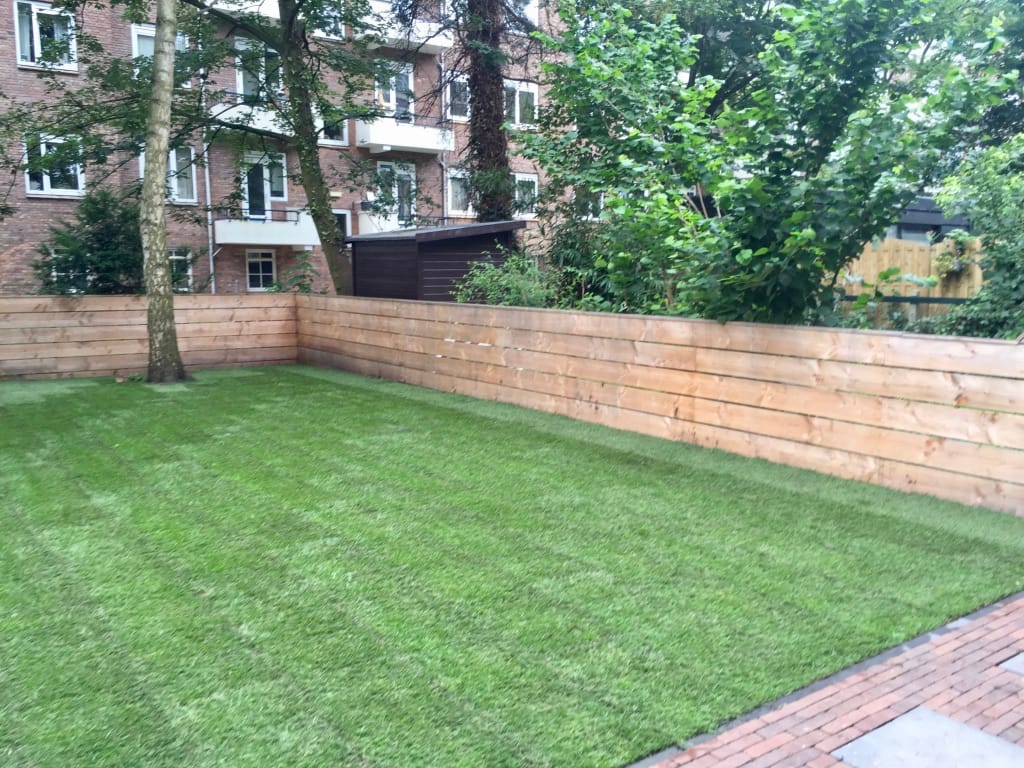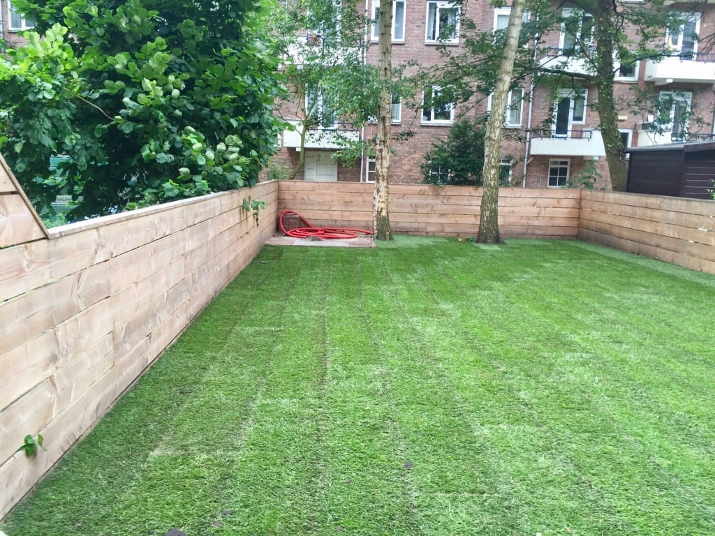 In deze ruime maar simpele tuin in Amsterdam hebben we 80 m2 graszoden aangelegd. Meestal hebben de tuinen in grote steden geen achterom, soms is er een brandgang waar we gebruik van kunnen maken. Wanneer dit er niet is dan kunnen we meestal nog door het huis zelf heen. Wel is het dan verstandig vooraf de vloer te beschermen met stucloper en eventueel wat karton tegen kozijnen te zetten als daar een krappe bocht is met de kruiwagen. De freesmachine kunnen we gedeeltelijk demonteren zodat deze op bijna alle plekken kan komen waar een kruiwagen ook Kan komen.