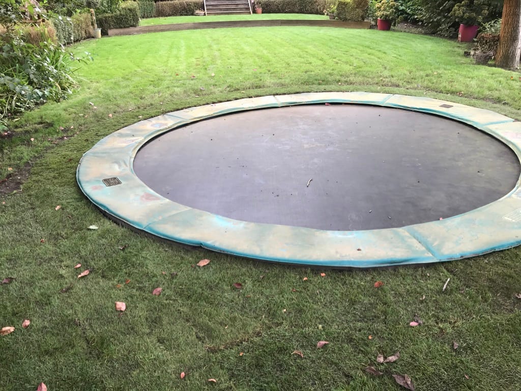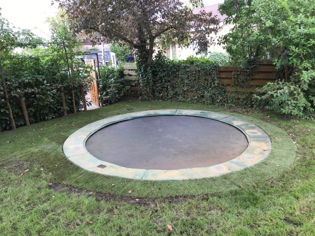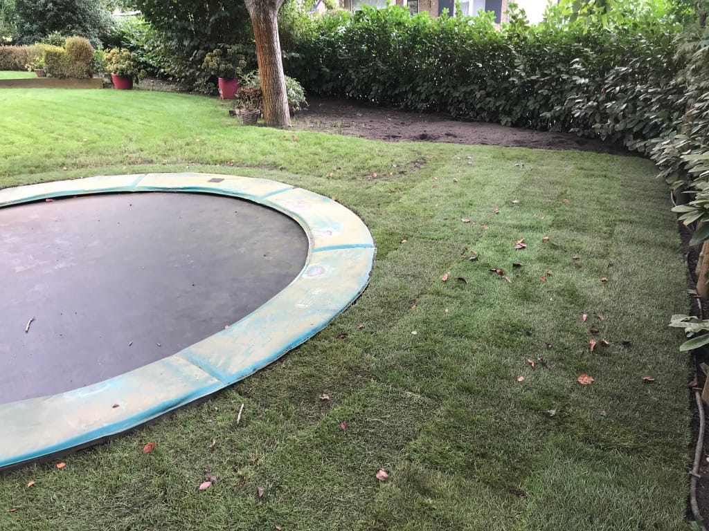Bij de renovatie van de tuin in Arnhem hebben we om de vijver een strak gazon mogen aanleggen. Daarnaast is er ook een trampoline ingegraven en hebben we de nieuwe graszoden op het oude gazon laten aansluiten. Het aansluiten kan goed gedaan worden door met een schep een randje in het gras te steken en daarna het gras/grond 2 cm dik weg te steken. De nieuwe zoden zijn ongeveer 2 cm dik en sluiten in de hoogte dan mooi aan op het oude gazon.