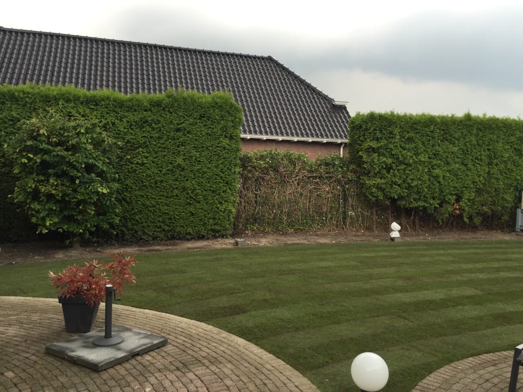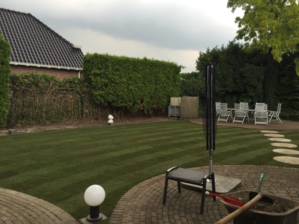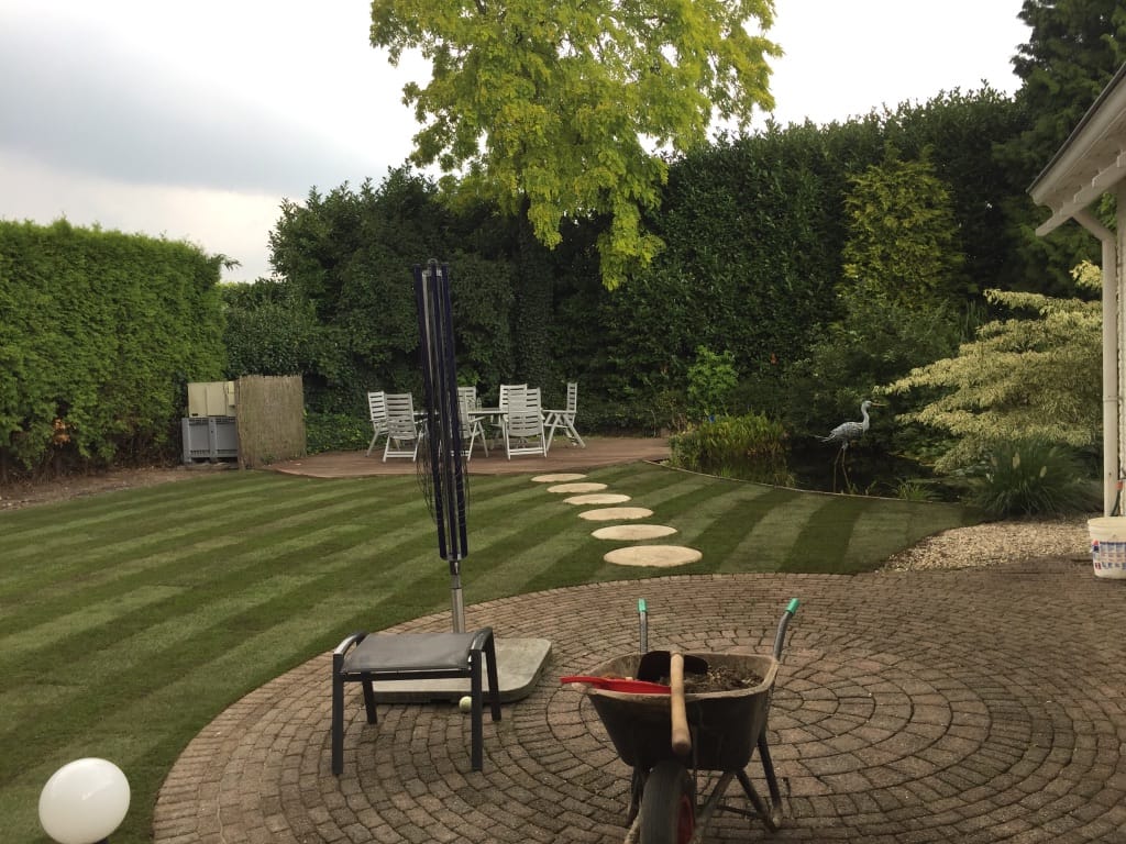 In Boven-Leeuwen hebben we 115 vierkante meter premium speelgazon graszoden aangelegd. Het is leuk om te zien dat de vleug van het gras bij de ene baan met gras naar links ligt en bij de andere baan naar rechts. Dit geeft hetzelfde beeld als het grasveld in een voetbalstadion. Het is wel van korte duur, na enkele dagen of na een maaibeurt zal u geen verschil meer zien. Het terras achter in de tuin is te bereiken via stap tegels oftewel step stones die mooi verzonken in het gazon zijn opgenomen.