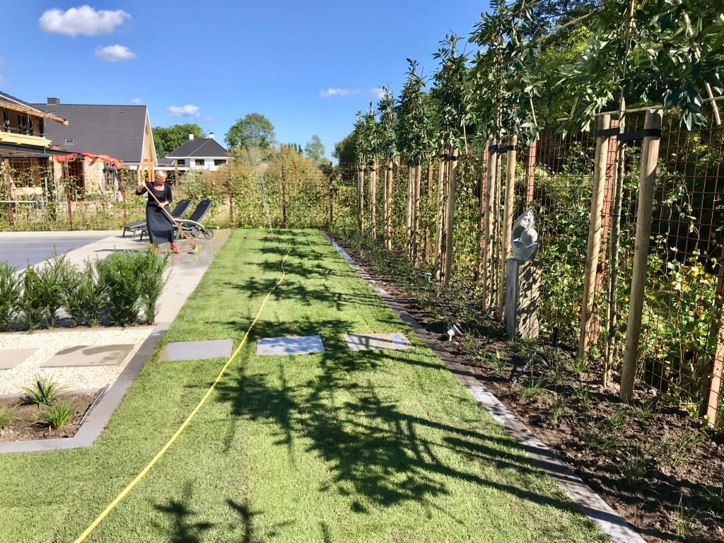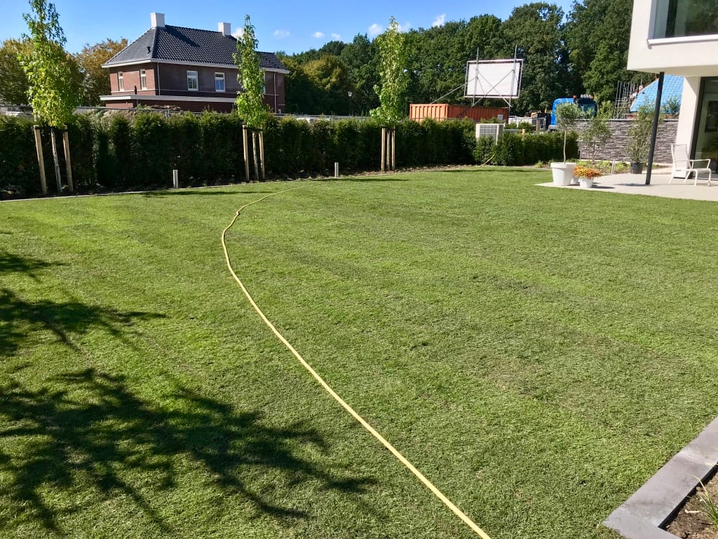 Voor een hoveniersbedrijf hebben we een gazon aangelegd in Culemborg. Bij de strakke woning hoort ook een strakke tuin met rechte lijnen. Om het gazon heen ligt een straatband van antraciet. Omdat de tegels besmettelijk waren zijn we met de graszoden via een achterpad de tuin in gegaan zodat het straatwerk helemaal schoon kon blijven.