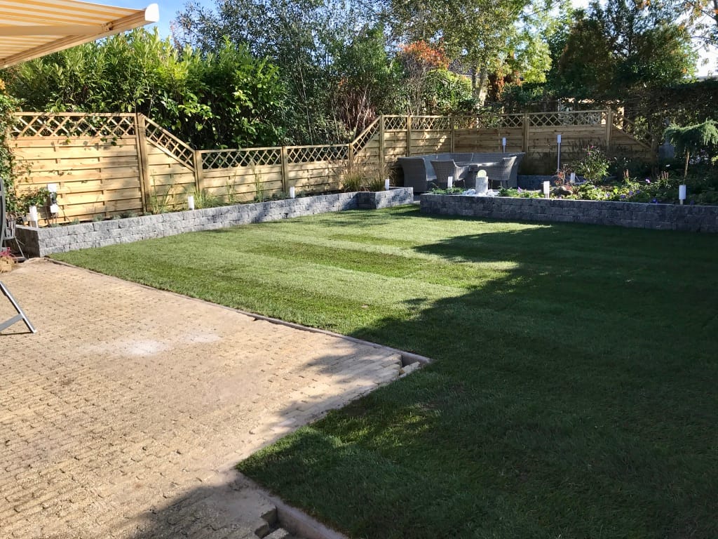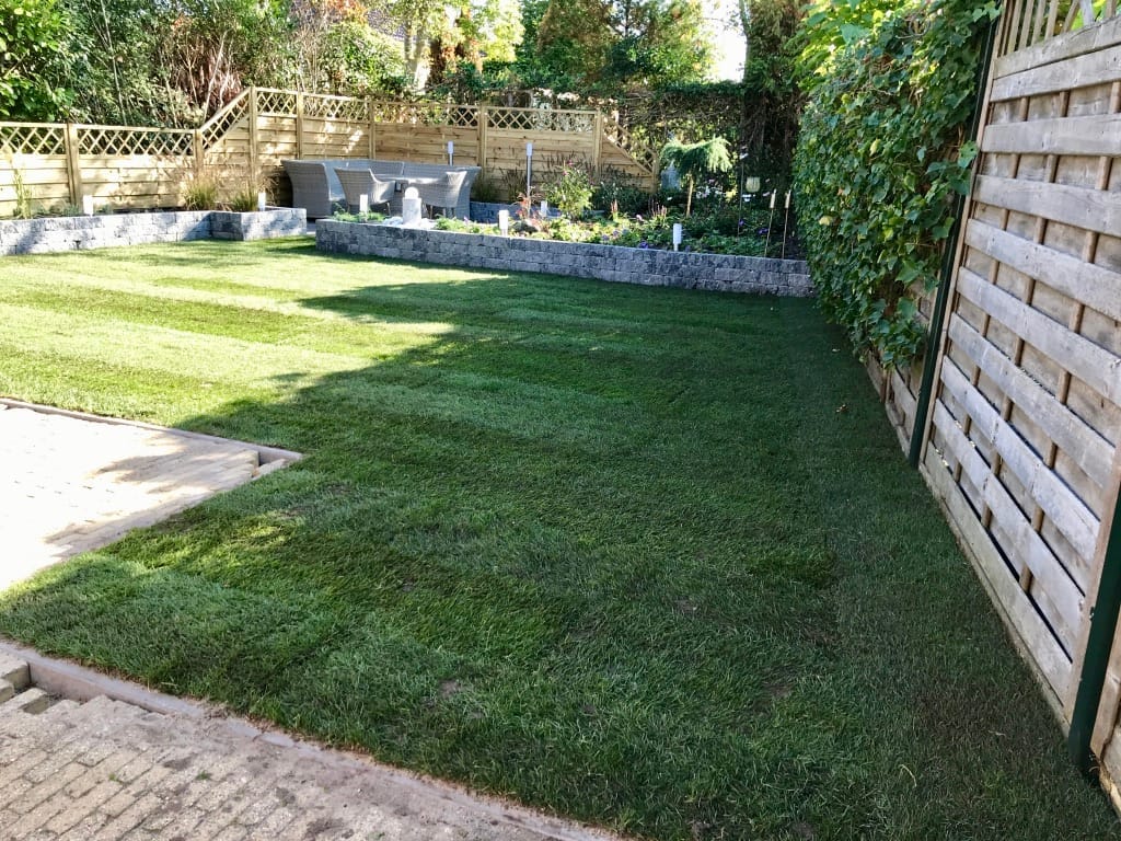 In een mooi brede achtertuin hebben we het puntje op de i mogen doen bij de renovatie van de tuin. Met het groeizame weer is het gras binnen enkele weken volledig vast gegroeid.