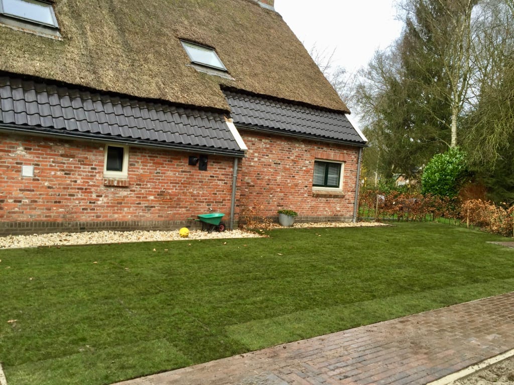 Na een wilde storm waarbij een grote boom was omgewaaid in de tuin in Drouwen was daar de perfecte gelegenheid om de tuin aan te pakken. Nadat er nieuw straatwerk was gelegd en mooie bloembakken waren gemaakt mochten wij het geheel af maken met mooie groene graszoden.