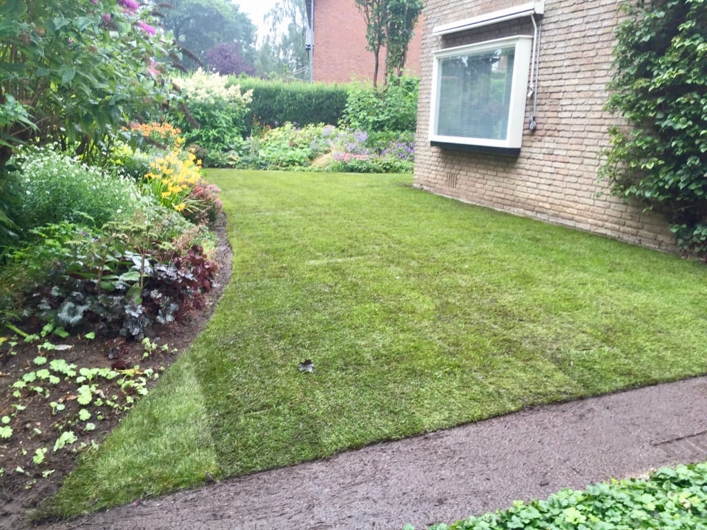 In Ede hebben we in een winderige bloementuin 75 vierkante meter oud gras verwijdert. Wanneer we oud gras verwijderen dan voeren we de oude zoden ook af. Dit geeft een mooi zwarte grondlaag die we kunnen bewerken met de freesmachine. Na het egaliseren zijn de meeste bewerkingen gedaan en zie je tijdens het gras leggen snel resultaat ontstaan.