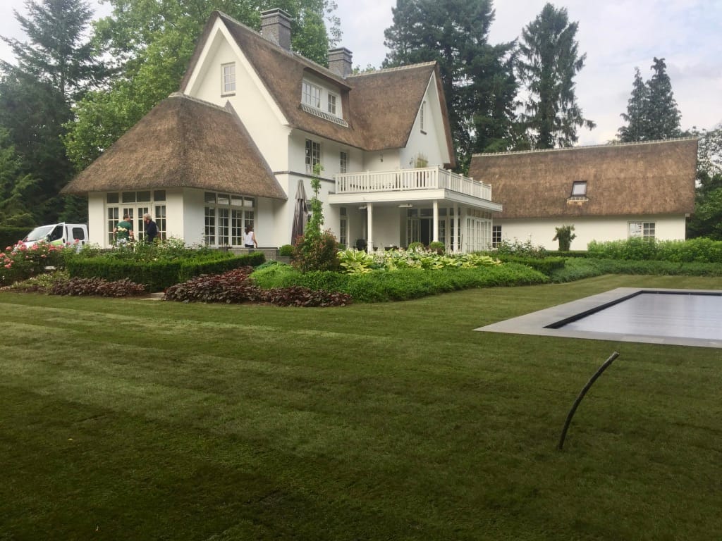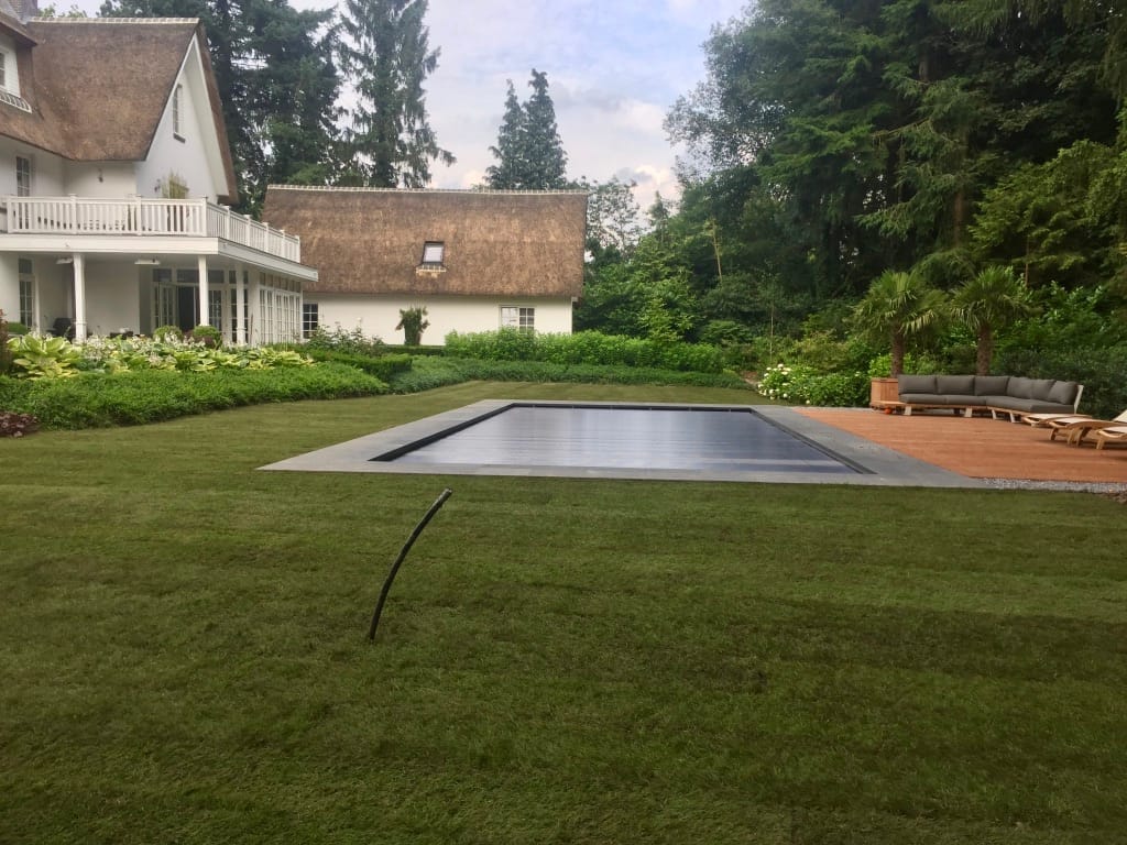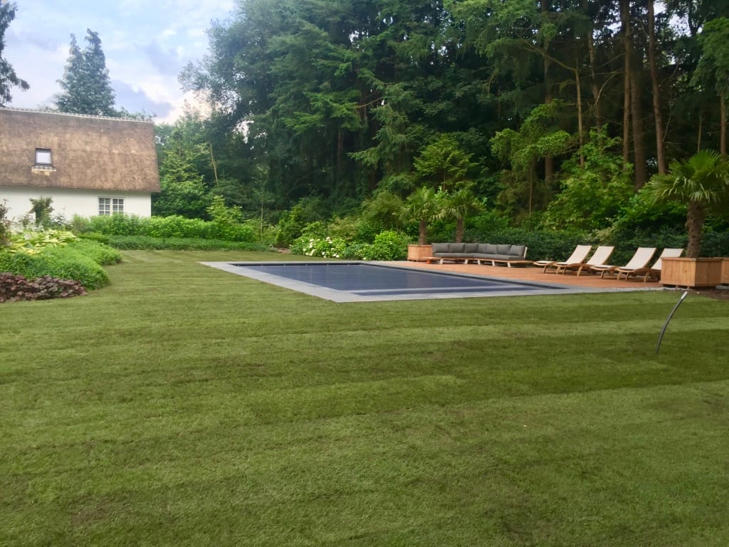 Bij een landelijke villa in Gorssel hebben we 500 vierkante meter graszoden aangelegd. De hoogte van het gras sluit mooi aan op de tegels rondom het zwembad. Door het kleur contrast van de tegels met de graszoden springt het zwembad ook goed uit. In het gazon zijn sproeiers opgenomen zodat het gras goed onderhouden kan worden.