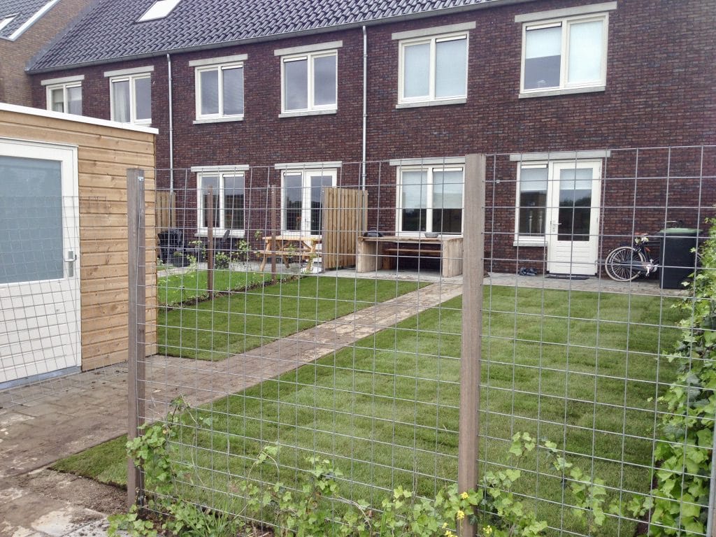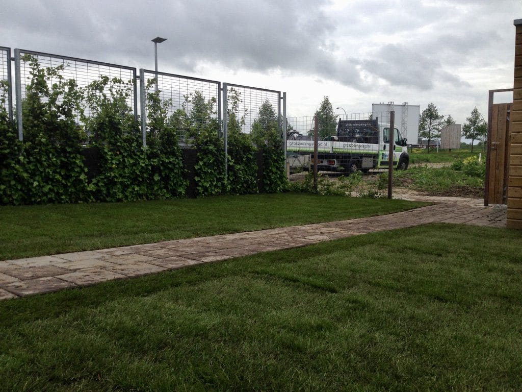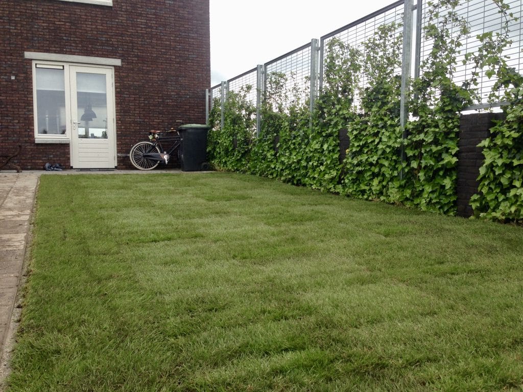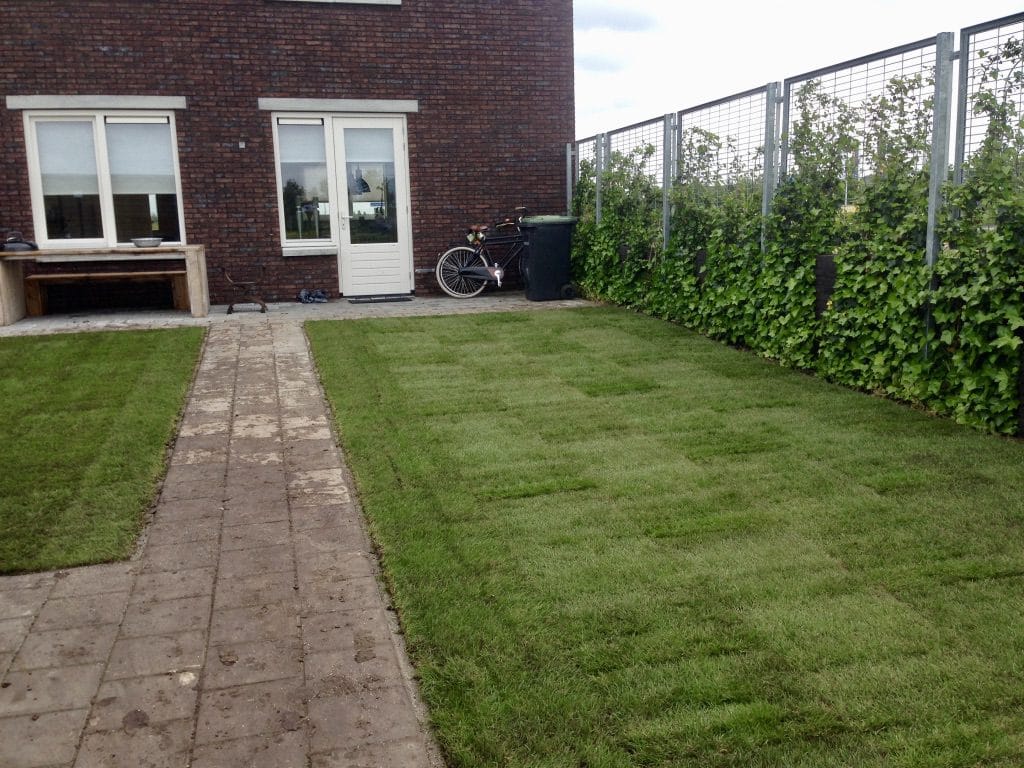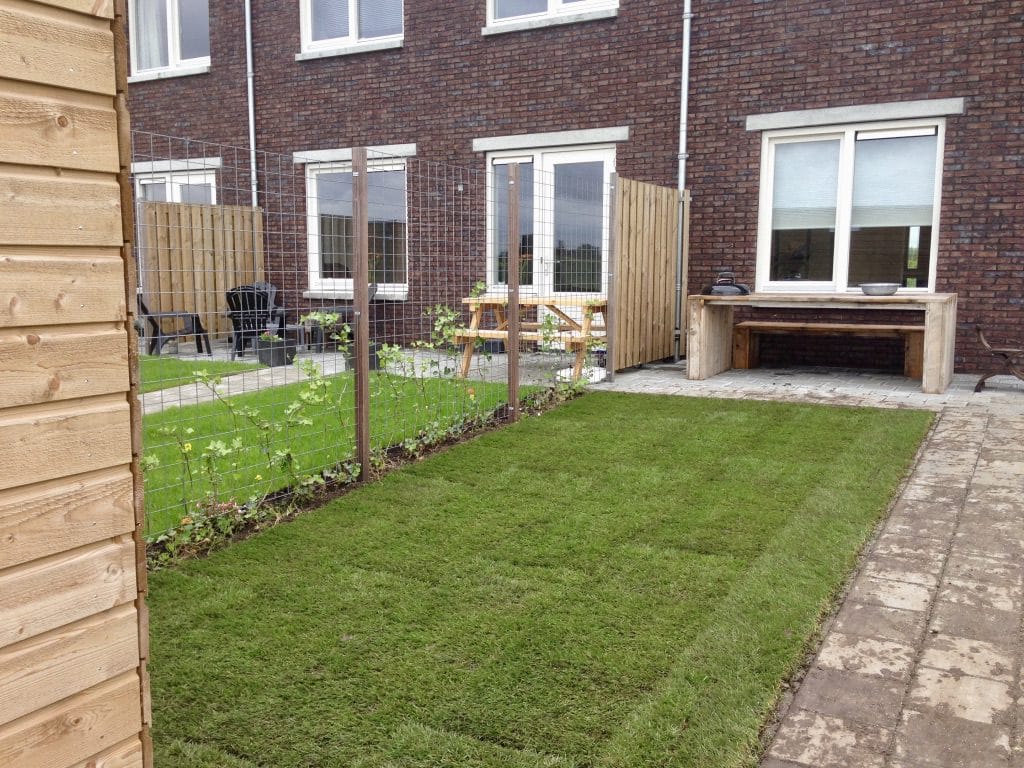 Op een nieuwbouwproject aan de west kant van Zwolle hebben we een klein gazon mogen aanleggen. De grond is hier behoorlijk vettig wat de aanleg lastig maakt en de tegels snel versmeren. De klei kluiten hebben we van de ondergrond afgeharkt en een klein laagje teelaarde aangebracht voor het makkelijker egaliseren van de ondergrond en zodat de grond minder snel dicht slibt. Tevens wordt de afvoer van water of de buffer voordat u last hebt van een te nat gazon vergroot.