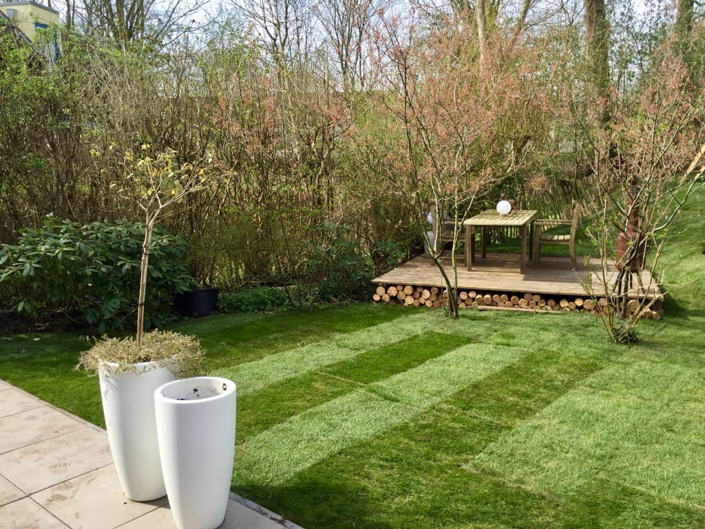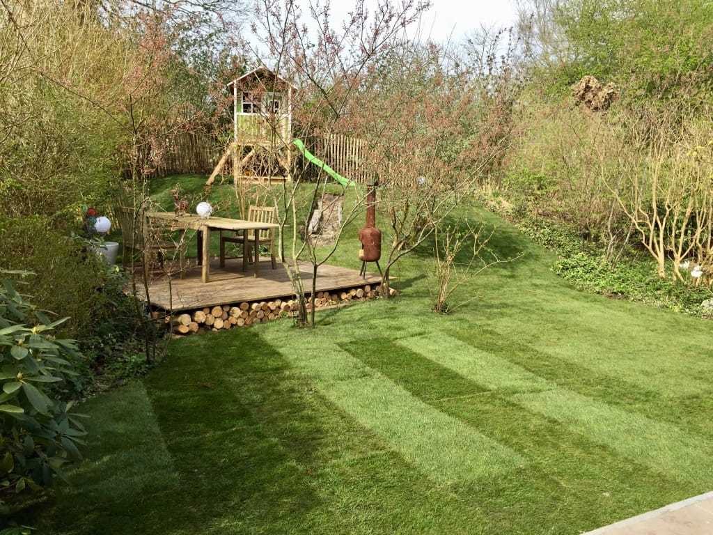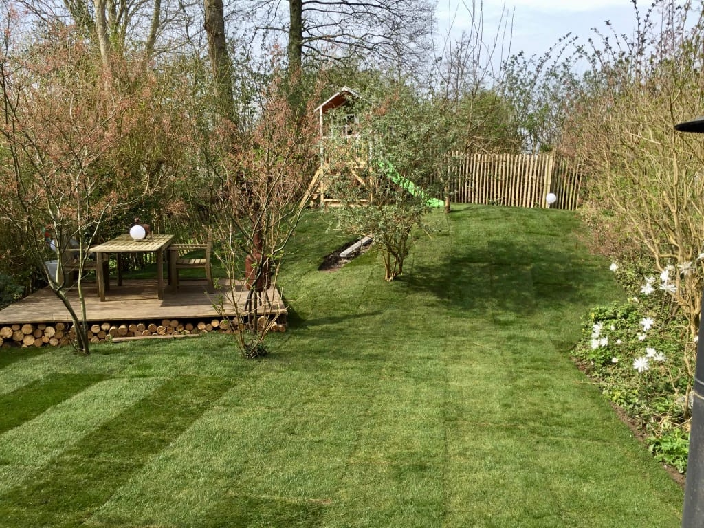 In Groningen hebben we een leuke speels gazon aangelegd. Vanwege de flinke hoogte verschillen in de tuin moest er op een andere manier met de tuin worden omgegaan. Achter in de tuin is een leuke speelhoek voor de minder gecreëerd doormiddel van onder andere een groot speeltoestel. Naar de voorkant loopt het gazon af zodat aan de voorkant een recht gazon is waarover je goed kan lopen naar het terras. Voor de aanleg zijn heuvels vaak een uitdaging en kan het gras niet altijd gewalst worden.