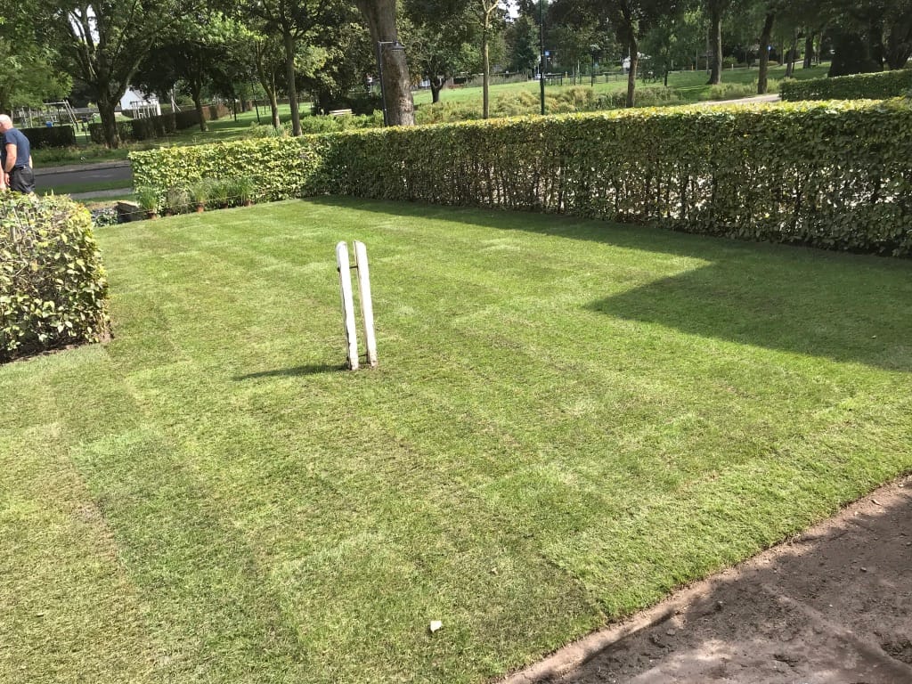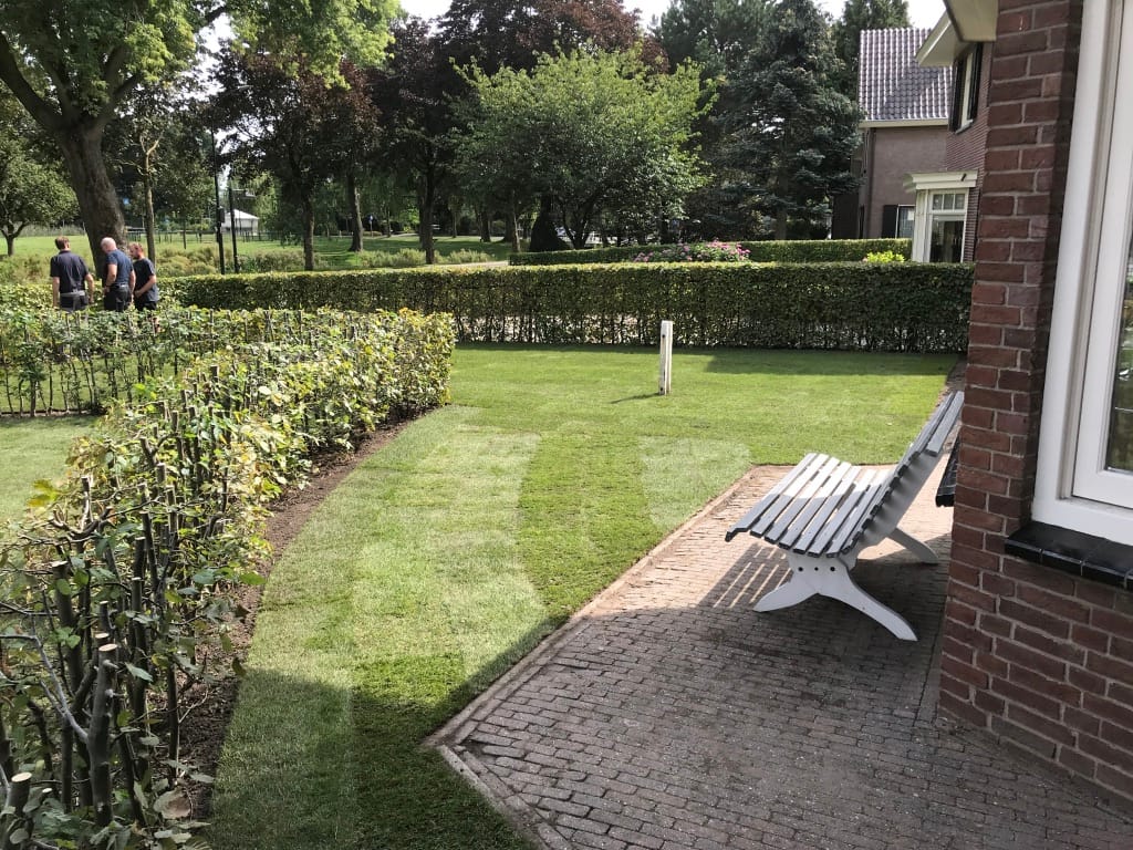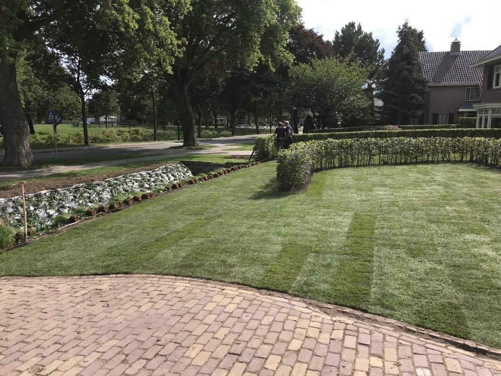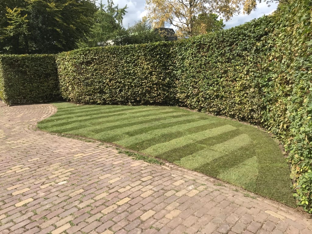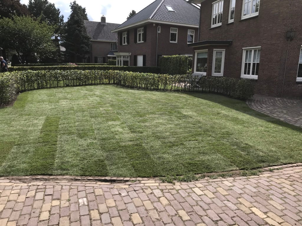 Voor een hoveniersbedrijf hebben we bij een klant in Haaften graszoden aangelegd. Het betrof hier de voortuin waarin een slingerende beukenhaag is opgenomen. De beukenhaag zorgt voor een speels geheel. Graszoden kunnen zoals u kan zien ook goed in rondingen en hoeken worden gelegd. Met een gekartelde broodmes zijn de graszoden eenvoudig op maat te snijden.