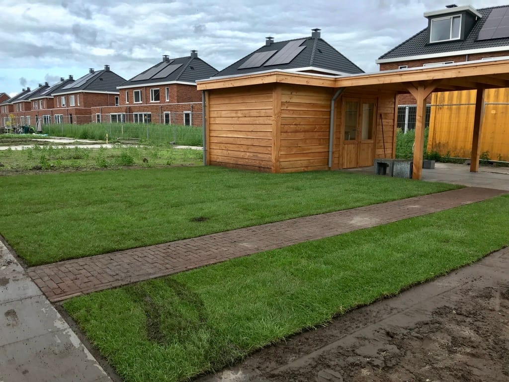 In de nieuwbouw van Heen hebben we een compact gazon aangelegd. De afwatering van de overkapping vindt wel plaats op het gazon wat geen mooie oplossing is voor het gras. Het gras onder de afwatering zal verdwijnen en modderig worden.