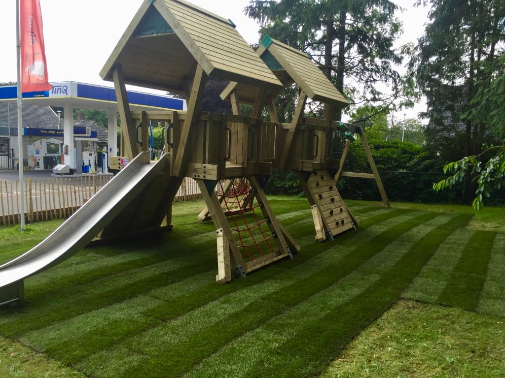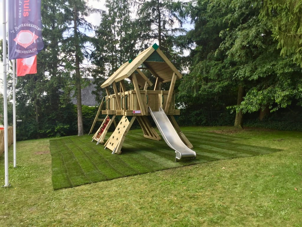 Voor pannekoekhuis Hoenderloo hebben we een speelveld van graszoden aangelegd onder een nieuw speeltoestel. Om er voor te zorgen dat de kleine bezoekers van het pannekoekhuis zich tijdens het wachten goed kunnen vermaken heeft onze opdrachtgever een groot speeltoestel laten plaatsen. Om snel gebruik te kunnen maken van het speeltoestel hebben we rondom het toestel graszoden aangelegd. Met groeizaam weer kan het gras binnen twee weken intensief betreden worden.