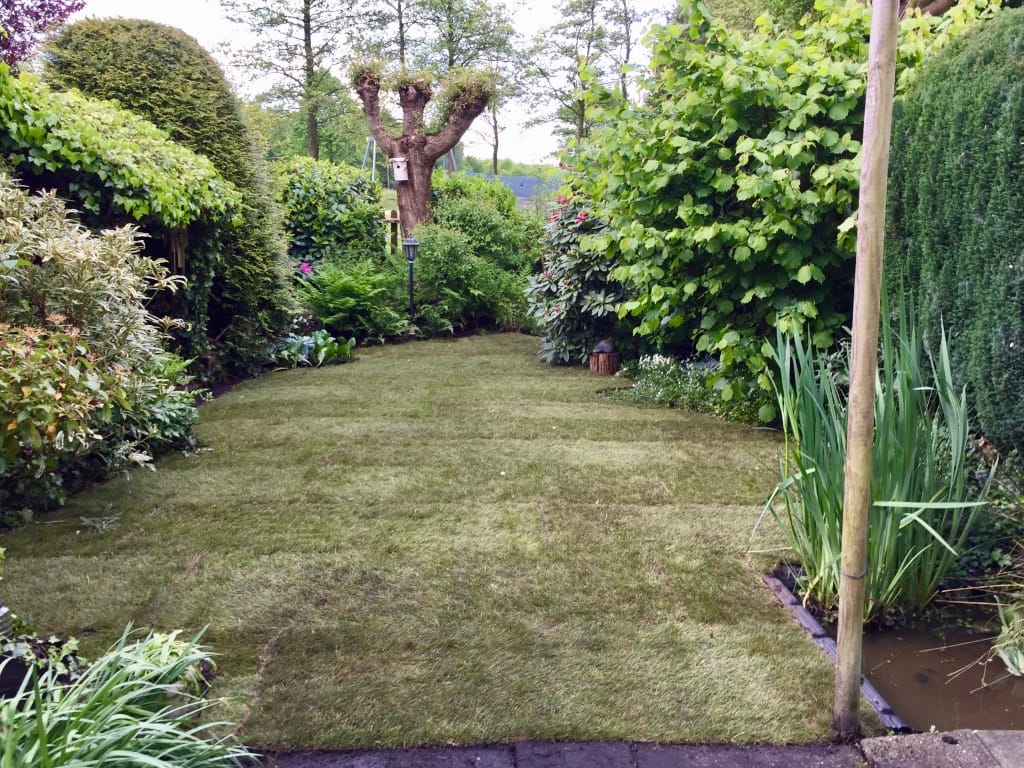 In een dicht beboste tuin in Hoogeveen hebben we toch plaats kunnen vinden voor een partij graszoden. Een mooi gazon zorgt er vaak voor dat de rest van de tuin, zoals straatwerk, overkapping en beplanting, er mooier uitspringt.