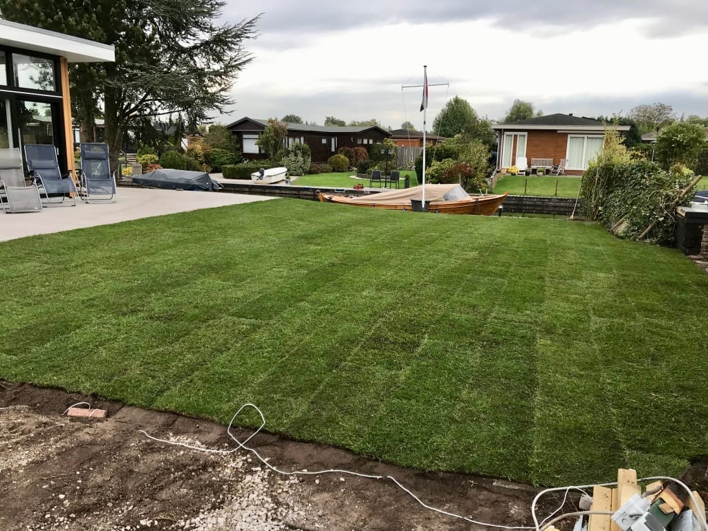 Op een camping in Loosdrechtsche Plassen hebben we bij een luxe vakantiehuisje graszoden aangelegd. De graszoden hebben we af laten lopen naar de waterkant, zodat ook het talud snel en mooi groen is.