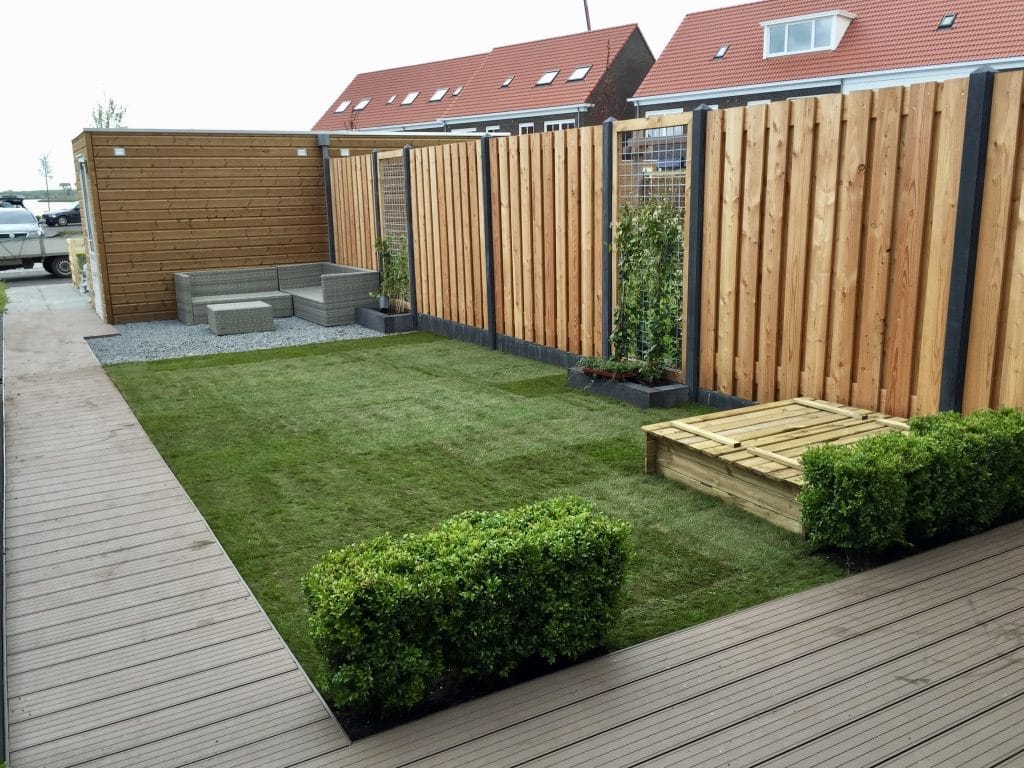 Dat een tuin niet groot hoeft te zijn bewijst deze klant met hun tuin in Meerstad. Door te werken met natuurlijke of natuurlijk oogende materialen en een beetje gras krijg je een hele leuke uitstraling.