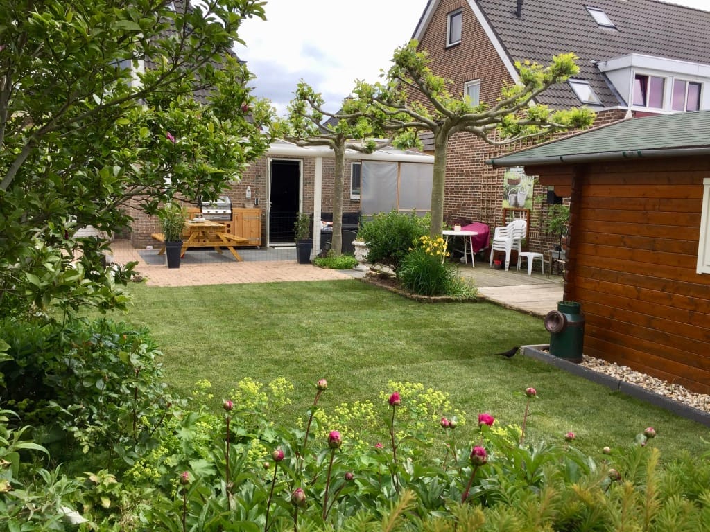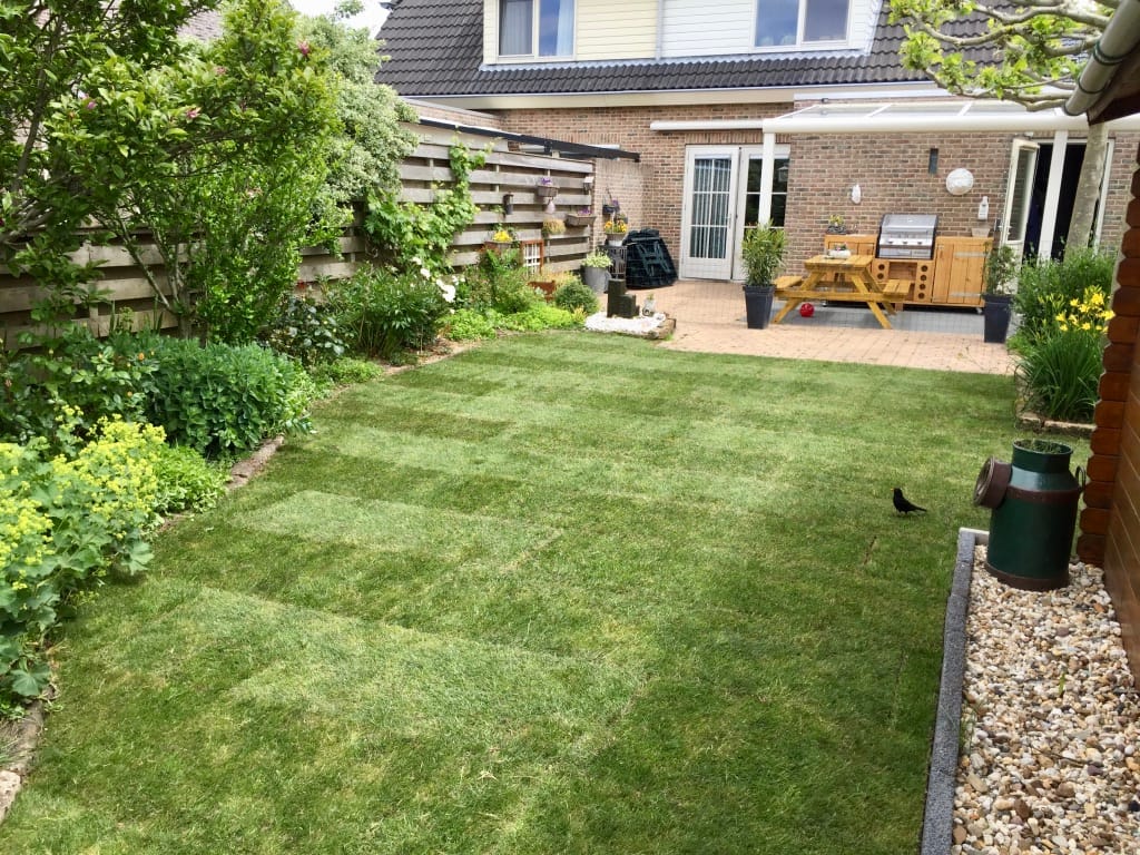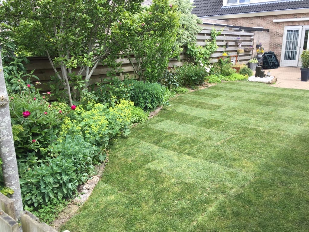 In Noordscheschut hebben we een compacte oud gazon vervangen doormiddel van het oude gras weg te snijden en af te voeren. De zwarte grond hebben we los gemaakt doormiddel van frezen. Na het egaliseren hebben we de graszoden gelegd, bemest en aangedrukt met onze motorische wals. De klant heeft er voor gekozen de border af te schermen door stenen. Dit zorgt voor een mooie afbakening en vereenvoudigt het maaien van het gras.