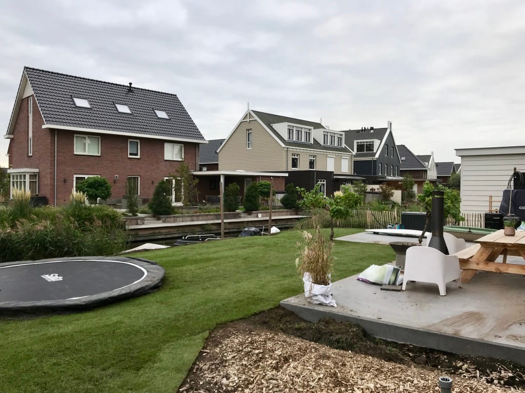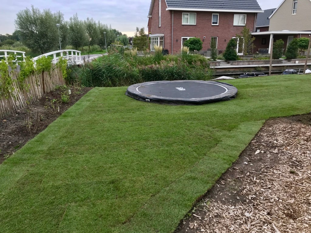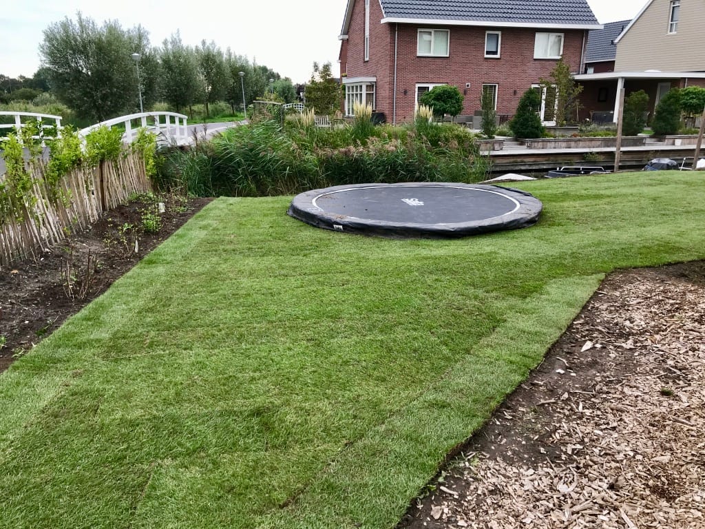 Rondom een nieuwbouwhuis in Oostzaan hebben we graszoden aangelegd. Een trampoline kan tegenwoordig niet meer achterblijven in een tuin waar regelmatig kinderen komen. Om een trampoline goed op te nemen in de tuin is ingraven een mooie maar wel bewerkelijke oplossing. Wanneer een trampoline is ingegraven hoeft er geen gebruik gemaakt te worden van een val net. Daarnaast is het wel veel veiliger dan wanneer de trampoline volledig boven de grond zou staan. Menig dokterspost krijgt namelijk kleine kinderen langs die van een hoge trampoline is gevallen.