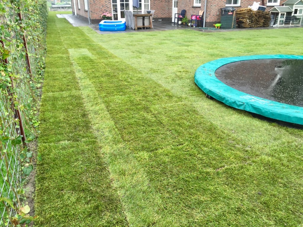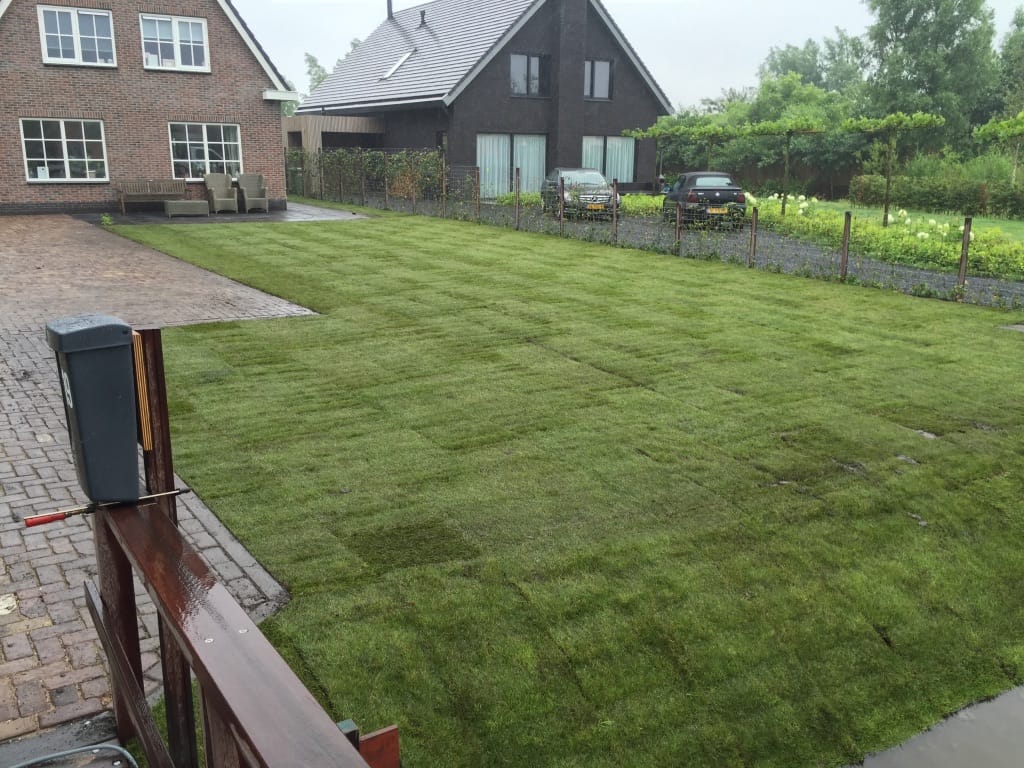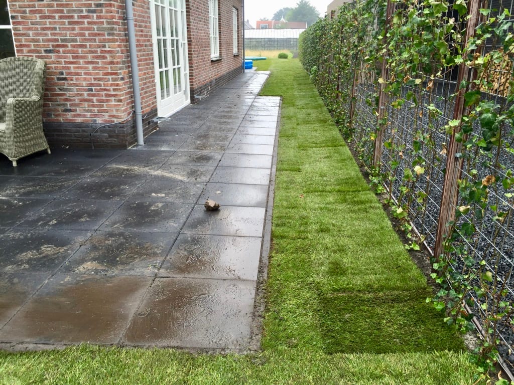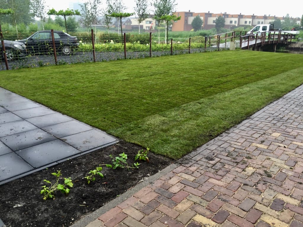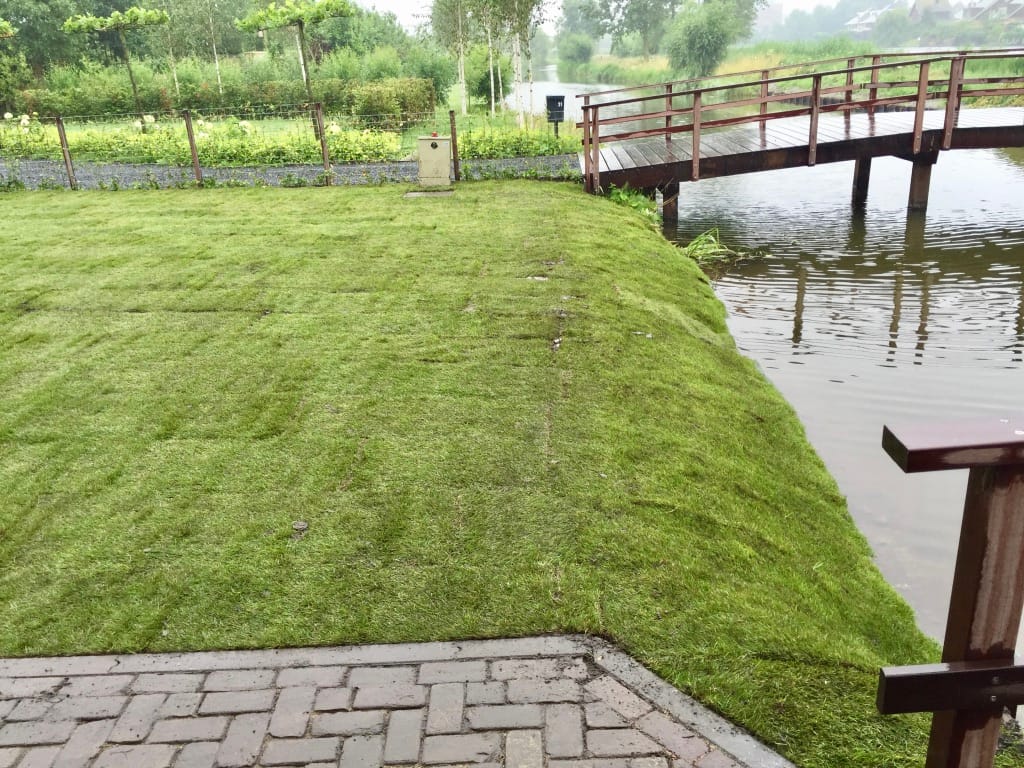 Bij een nieuwbouwwoning in Sint-Pancras moesten we over een houten bruggetjes de graszoden aanvoeren. Het bruggetje is prima voor personen auto’s maar een BE combinatie is te veel. Simpel opgelost, we lopen gewoon iets verder met de kruiwagen. Een talud beelden met graszoden behoort ook tot de mogelijkheden. Deze kan helaas niet gewalst worden maar zal zeker goed gaan vast groeien.