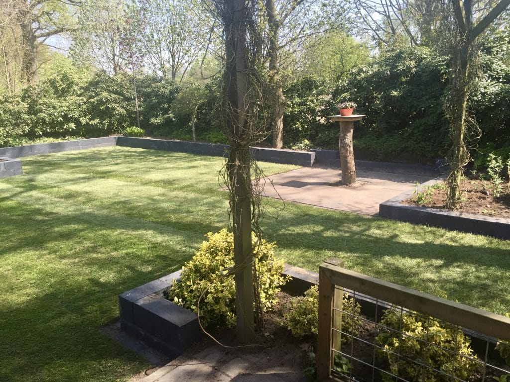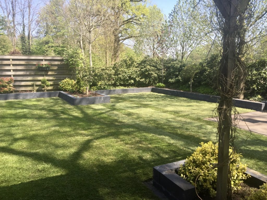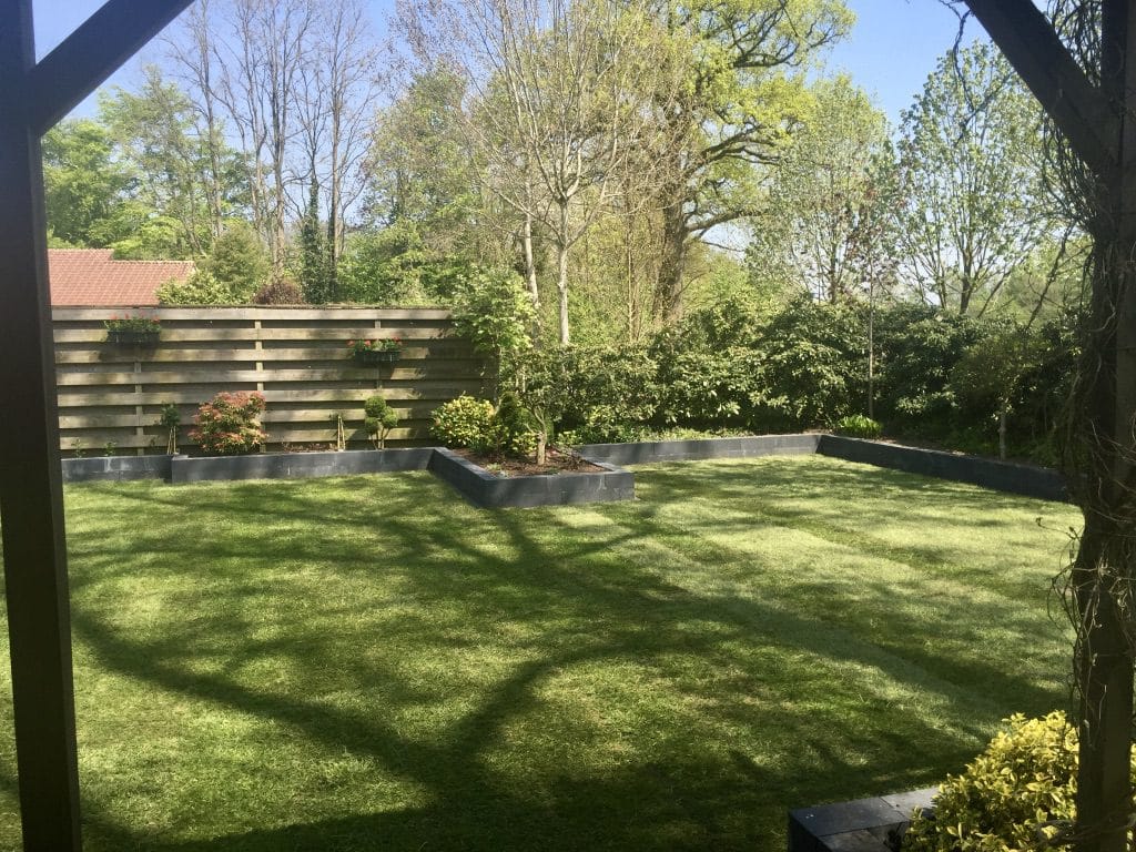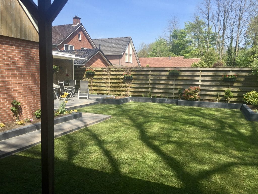 Het gazon heeft strakke lijnen waardoor er weinig snijverlies ontstaat. De antraciete bloembakken zorgen voor een grondkering en een mooi contrasterende kleur met het gras. De klant heeft voor de aanleg van het gras een straatbandje langs de blokken gemaakt. Dit zorgt er voor dat het gras eenvoudig te maaien is en dat er bijna geen trimmer gebruikt hoeft te worden.