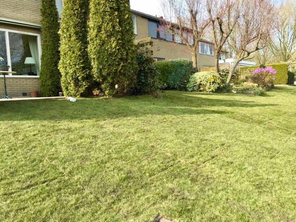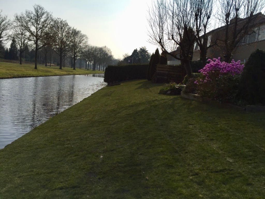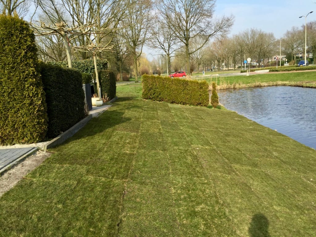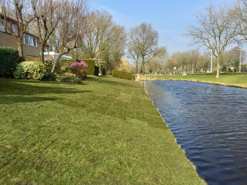 Voor een groep buurtbewoners hebben de gezamenlijke gazon dat uitloopt op het water vervangen. Gras op een talud vervangen is extra lastig en bewerkelijk. Vanwege de schuinte moeten veel machines met extra mensen worden bedient of begeleid zodat ze niet in het water terecht kunnen komen. Tevens zorgt de vettige ondergrond, die continu vochtig is, voor een lastige opdracht. Het eindresultaat mag er echter zijn!