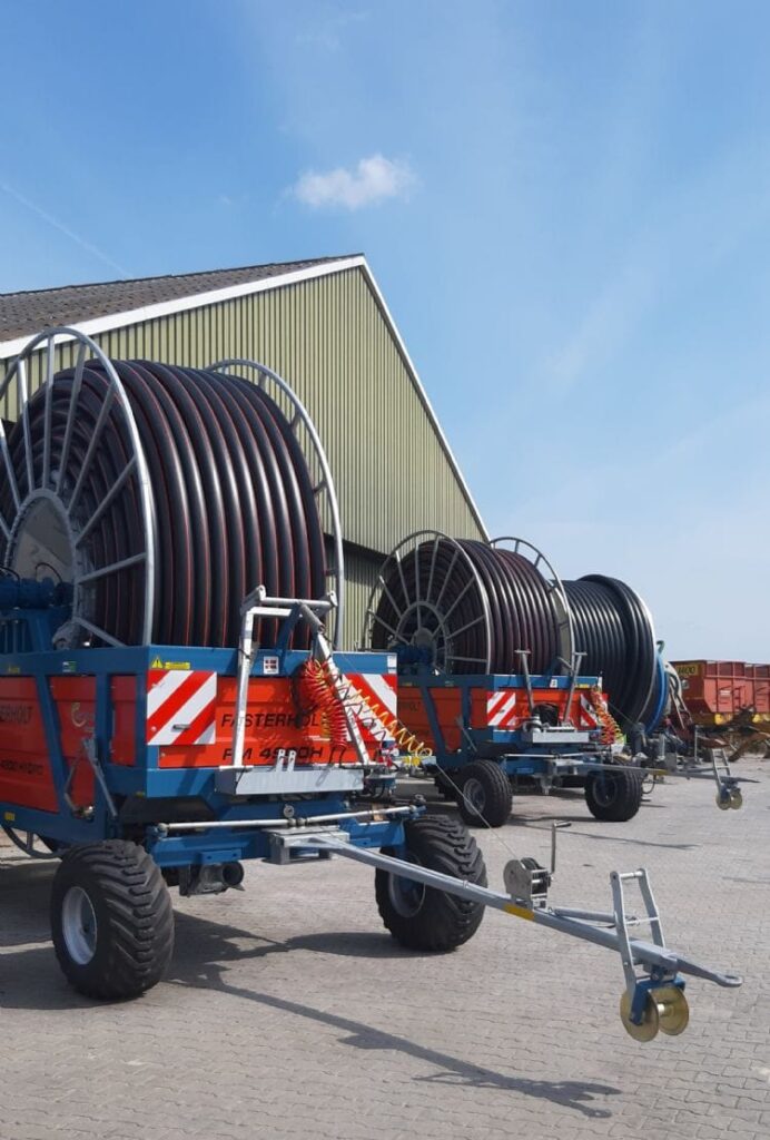 Graszodenkopen.be heeft ook speciale haspels aangeschaft. ‘Deze Fasterholt-haspels zijn langer dan gemiddeld. De langste die wij hebben is 850 meter. Die kun je helemaal uittrekken, daarna wordt hij teruggetrokken. Hierdoor kun je ervoor kiezen om bijvoorbeeld maar 5 mm water te geven, of 10 mm. Bij een traditionele haspel ben je haast gedwongen om minimaal 15 mm te geven, want de haspel kan niet sneller de slang binnentrekken. Nu kunnen we exact de hoeveelheid water geven die we willen. De pomp hoeft daardoor minder lang te draaien en zo zijn we brandstoftechnisch gunstiger uit. Als het erg droog is en we moeten zaaien, kunnen we door een klein beetje water te geven er toch voor zorgen dat het zaad snel gaat kiemen.’